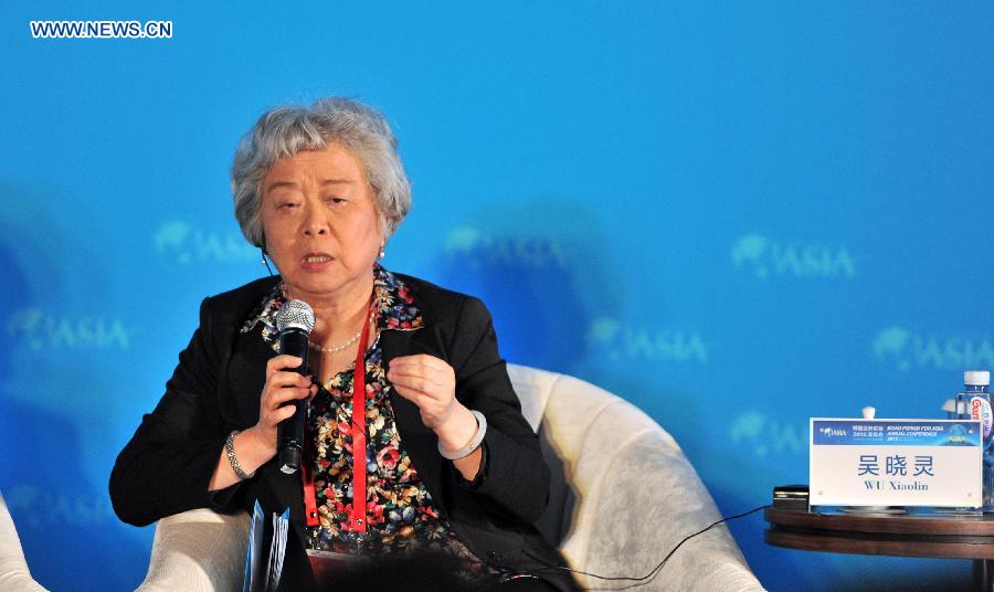 Wu Xiaoling, vice chairman of Financial and Economic Affairs Committee of National People's Congress, speaks at a sub-forum with the theme of "The Asset Management Boom: Innovation, Risks & Regulation" during the 2015 Boao Forum for Asia (BFA) in Boao, south China's Hainan Province, March 27, 2015. (Xinhua/Yang Guanyu)