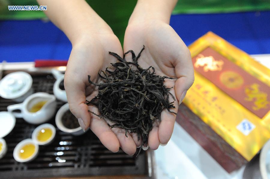 A woman shows Chinese tea during 2015 China-Asean Expo Thailand Exhibition in Bangkok, Thailand, April 2, 2015. China-Asean Expo featured Chinese-made products of high quality under different categories. (Xinhua/Rachen Sageamsak)