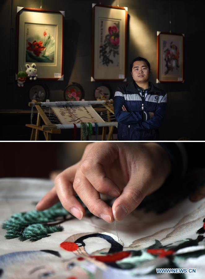 Combined photo taken on March 27, 2015 shows a portrait of Jiang Tongwan (upper) and a work of Hunan embroidery he made at a studio in Jinggang Ancient Town in Changsha, central China's Hunan Province. Jiang Tongwan, born in 1989, suffered from physical disability resulted from a disease in childhood. He was one of the first male graduates majored in Hunan embroidery. After graduation, he gave up the chance to work in enterprises the school recommended. Together with his classmate, Jiang rent a shop at Jinggang Ancient Town and sold their works. The sales volume of their studio last year reached over 100,000 yuan (about 16,140 U.S. dollars). (Xinhua/Li Ga) |