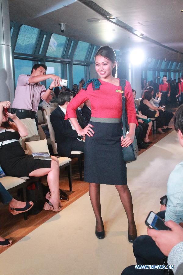 A stewardess displays a new uniform in Singapore, April 10, 2015. SilkAir, a regional unit of Singapore Airlines, launched a new collection of uniforms for its over 500 cabin crew on Friday. The new one-piece uniform comes in two variations - aqua-blue for junior crew and plum-red for senior crew. The new uniform, created by local fashion designer Alexandria Chen, marks SilkAir's fourth uniform change over 26 years and will roll out on all fights on April 15. (Xinhua/Bao Xuelin)