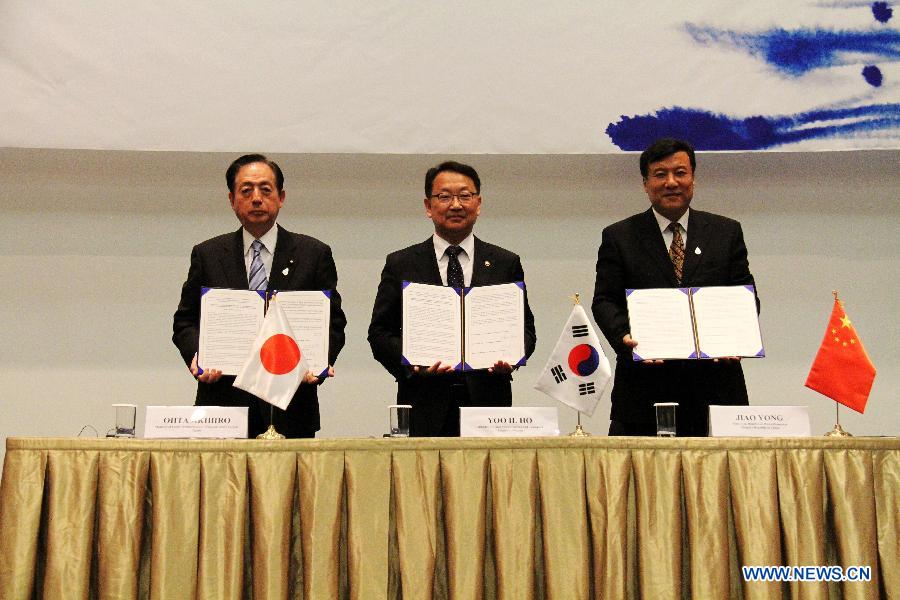 China's Vice Minister of Water Resources Jiao Yong, South Korea's Minister of Land, Infrastructure and Transport Yoo Il-ho and Japan's Minister of Land, Infrastructure, Transport and Tourism Ohta Akihiro (R-L) pose for photo after signing a joint statement during a trilateral ministerial meeting at the seventh World Water Forum held in Gyeongju, South Korea, April 13, 2015. China, South Korea and Japan on Monday agreed to strengthen trilateral cooperation on water policy innovation during the seventh World Water Forum held in South Korea's southeastern cities of Daegu and Gyeongju. (Xinhua/Peng Qian)