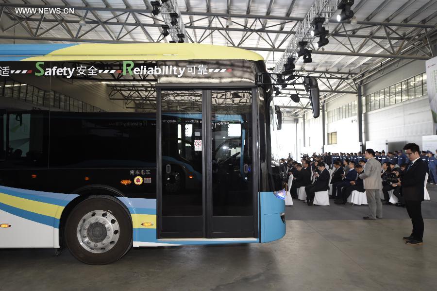 Photo taken on April 16, 2015 shows a 18-meter-long BRT with super capacitor at the Ningbo base of China South Railway (CRS) in Ningbo, east China's Zhejiang Province. Trolley buses with super capacitor featured high power start-up, quick charge and high recycling efficiency. They will be fully charged at a bus station within 30 seconds and running over 5 kilometers. The service life for such a trolley bus will last as long as 12 years. (Xinhua/Ju Huanzong) |
