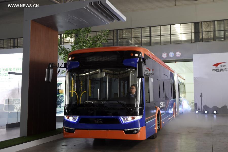 Photo taken on April 16, 2015 shows a 18-meter-long BRT with super capacitor at the Ningbo base of China South Railway (CRS) in Ningbo, east China's Zhejiang Province. Trolley buses with super capacitor featured high power start-up, quick charge and high recycling efficiency. They will be fully charged at a bus station within 30 seconds and running over 5 kilometers. The service life for such a trolley bus will last as long as 12 years. (Xinhua/Ju Huanzong) |