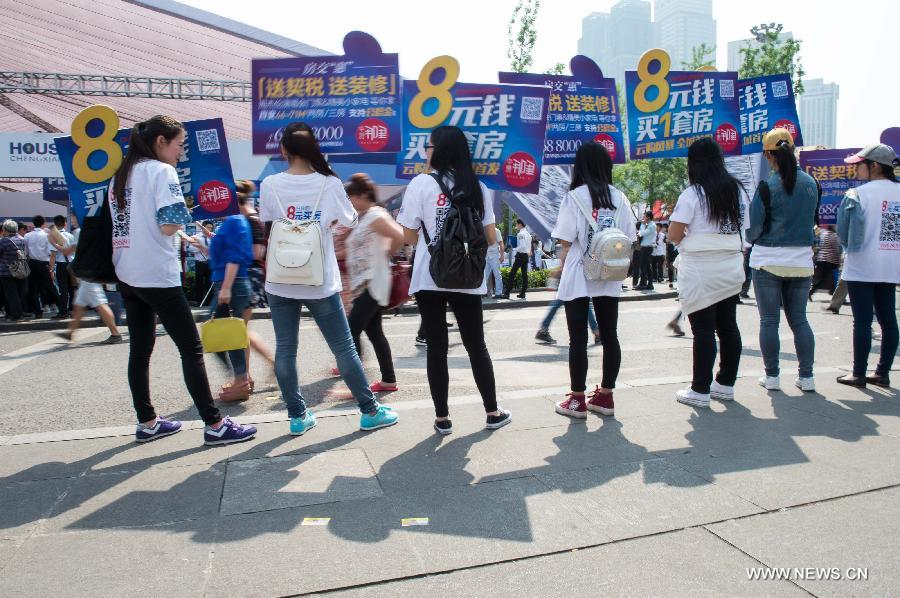 Promoters of a real estate company hold billboards to attract people at a housing trade fair in southwest China's Chongqing Municipality, April 16, 2015. The four-day spring housing trade fair of Chongqing kicked off here Thursday, with 161 housing projects on display. (Xinhua/Liu Chan)