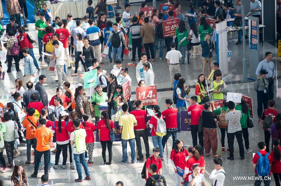 People attend a housing trade fair in southwest China's Chongqing Municipality, April 16, 2015. The four-day spring housing trade fair of Chongqing kicked off here Thursday, with 161 housing projects on display. (Xinhua/Liu Chan)