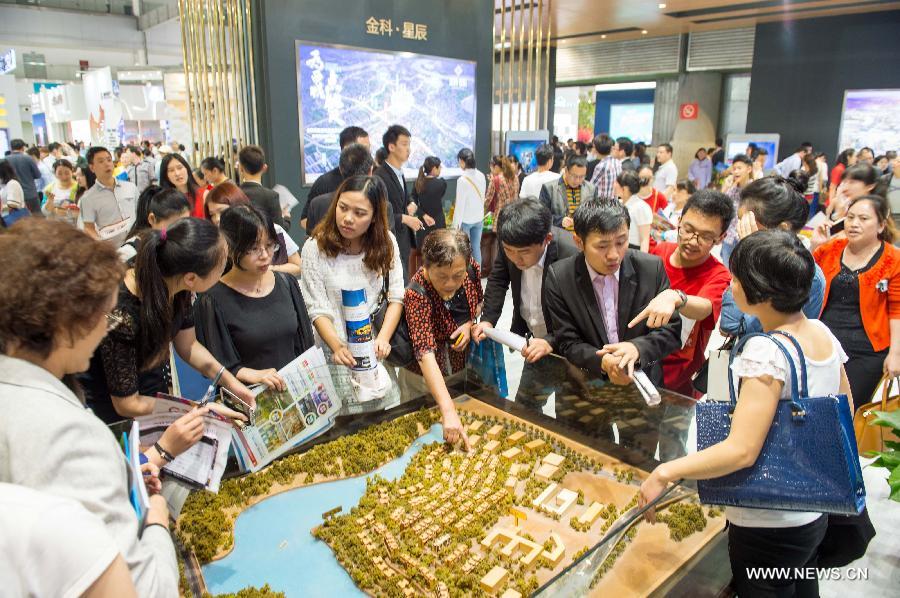 People inquire around the sand table of a real estate project at a housing trade fair in southwest China's Chongqing Municipality, April 16, 2015. The four-day spring housing trade fair of Chongqing kicked off here Thursday, with 161 housing projects on display. (Xinhua/Liu Chan)