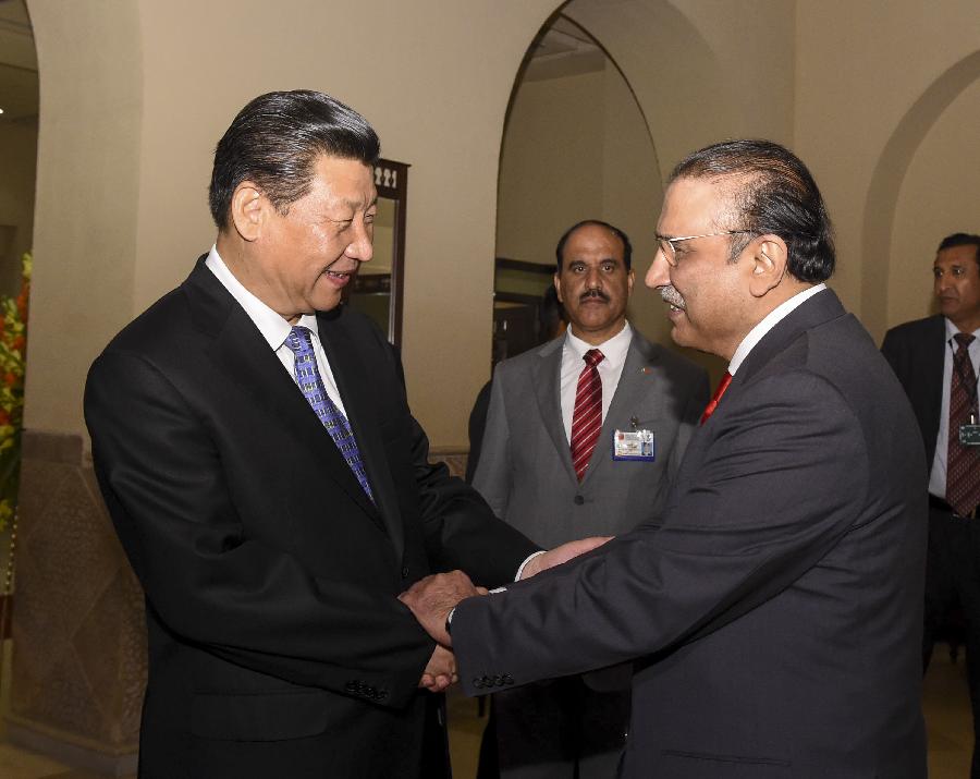 Chinese President Xi Jinping (L) shakes hands with Asif Ali Zardari, former Pakistani president and co-chairperson of the Pakistan People's Party (PPP), as he met with leaders of the Pakistani major parties in Islamabad, capital of Pakistan, April 20, 2015. (Xinhua/Li Xueren) |