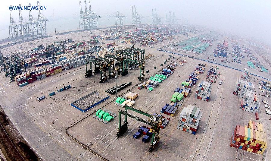 Photo taken on March 30, 2015 shows a scene of the Dongjiang dock in Port of Tianjin, part of the China (Tianjin) Pilot Free Trade Zone in north China's Tianjin Municipality. Three new free trade zones (FTZ) began official operation on April 21, 2015 as China seeks to draw more international commerce. (Xinhua/Yue Yuewei) |