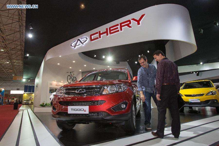 | Visitors look at a Chery "Tiggo 5" car in Sao Paulo, Brazil, Nov. 6, 2015. China's Chery Automobile Co., Ltd. has spent more than seven percent of their annual saleroom on the development of new products since 2002. There are more than 6,000 members in its research and development department. After a ten-year independent innovation, Chery Auto has owned more than 7,000 authorized patents. (Xinhua/Xu Zijian) |