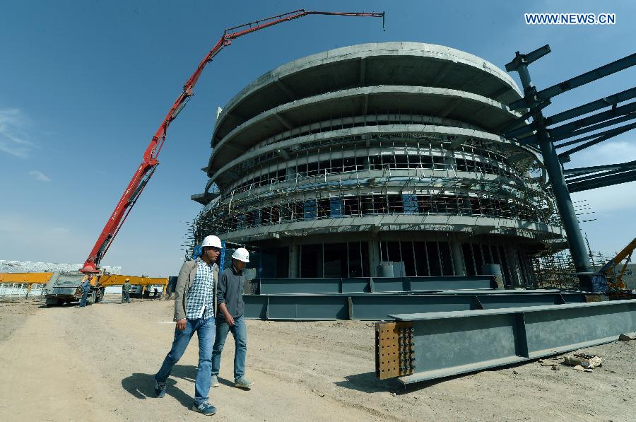 Laborers work at the construction site of the Lanzhou comprehensive bonded zone in Lanzhou, capital of northwest China's Gansu Province, May 8, 2015. The project is expected to be completed by the end of June. (Xinhua/Fan Peishen)