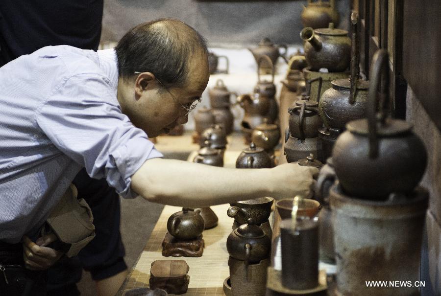A visitor chooses tea sets during the 10th China Yunnan Pu'er Tea Expo in Kunming, capital of southwest China's Yunnan Province, May 15, 2015. The four-day tea expo, kicked off in Kunming on Friday, attracting over 400 tea companies. (Xinhua/Lyu Shuai) |