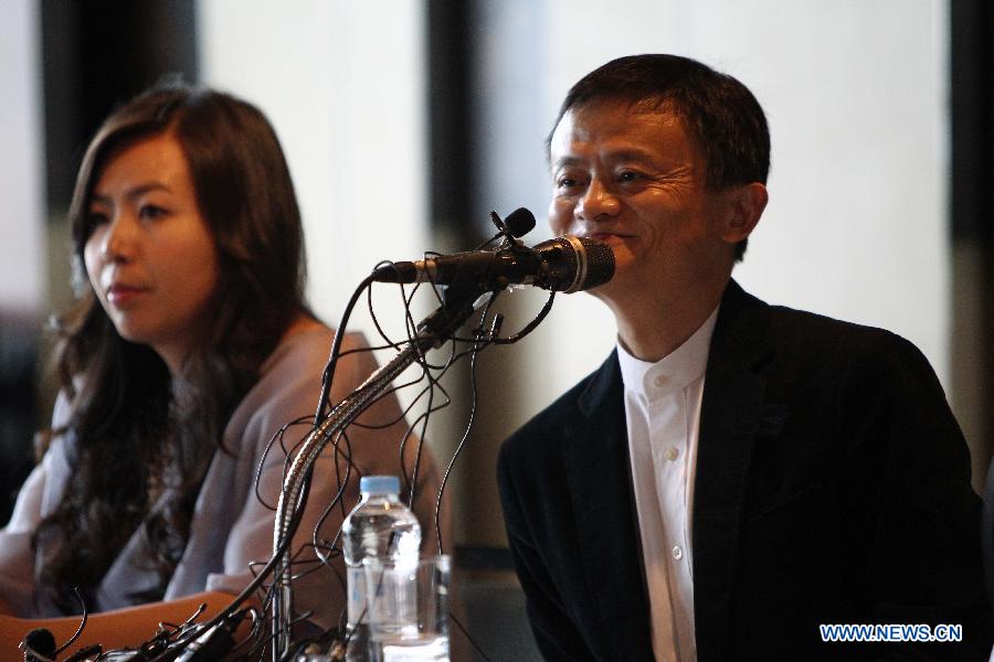 Jack Ma (R), founder and executive chairman of Alibaba Group, attends a news conference held in Seoul, capital of South Korea, on May 19, 2015. South Korea's finance ministry said Alibaba wants to make South Korea one of its global logistics hubs and it is seeking a partner for this endeavour. Alibaba Group is also working with Korea International Trade Association to initiate a youth internship program that will enable 100 Korean college graduates to work as intern at Alibaba Group's headquarters in Hangzhou. (Xinhua/Seongbin Kang)