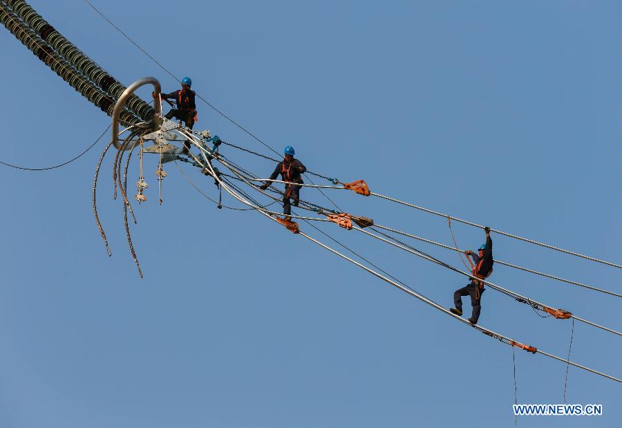 Workers work on 1,000-kilovolt power transmission project in east China (4)