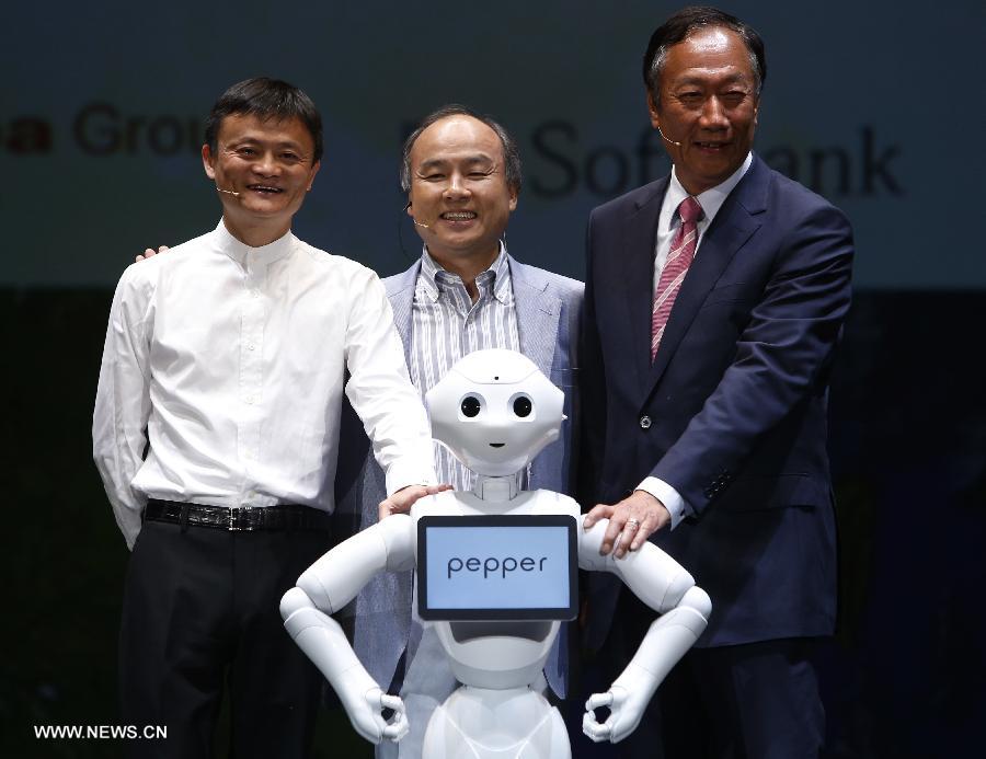 (From L) Jack Ma, or Ma Yun, Chairman of the Board of Alibaba Group, Softbank's president Masayoshi Son, and Terry Gou, founder and chairman of Foxconn, pose for photo with a humanoid robot "Pepper" during the Softbank's press conference in Chiba, near Tokyo, Japan, June 18, 2015. Softbank announced that it will start to sell the emotional robot to the public on June 20 with the price of 198,000 yen (about 1,610 U.S. dollars). (Xinhua/Stringer) |