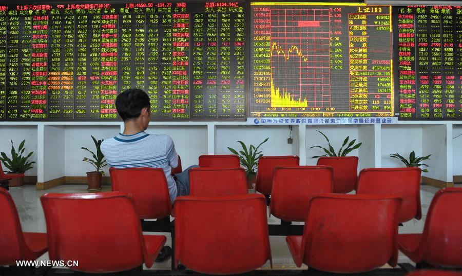 An investor looks through stock information at a trading hall in a securities firm in Haikou, capital of south China's Hainan Province, June 19, 2015. Chinese stocks plunged on Friday, with the benchmark Shanghai Composite Index diving 6.42 percent, to finish at 4,478.36 points. The Shenzhen Component Index plunged 6.03 percent, to close at 15,725.47 points. (Xinhua/Zhao Yingquan) |