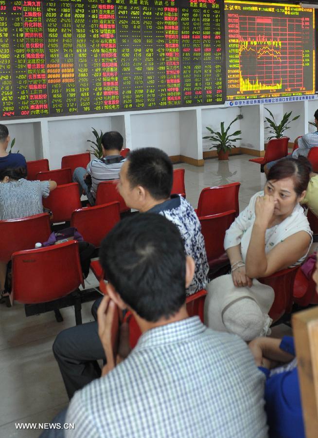 Investors look through stock information at a trading hall in a securities firm in Haikou, capital of south China's Hainan Province, June 19, 2015. Chinese stocks plunged on Friday, with the benchmark Shanghai Composite Index diving 6.42 percent, to finish at 4,478.36 points. The Shenzhen Component Index plunged 6.03 percent, to close at 15,725.47 points. (Xinhua/Zhao Yingquan) |