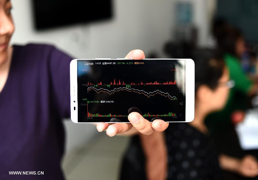 An investor shows stock information on his cellphone at a trading hall in a securities firm in Shenyang, capital of northeast China's Liaoning Province, June 19, 2015. Chinese stocks plunged on Friday, with the benchmark Shanghai Composite Index diving 6.42 percent, to finish at 4,478.36 points. The Shenzhen Component Index plunged 6.03 percent, to close at 15,725.47 points. (Xinhua/Li Gang) |
