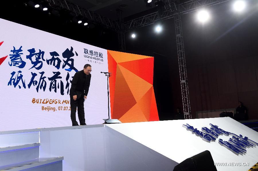 Liu Chuanzhi, founder and chairman of Legend Holdings, acknowledges applause during a business event with the theme of "Builders and Movers" held by Legend Holdings in Beijing, capital of China, July 7, 2015. Legend Holdings, the parent company of the world's largest PC maker Lenovo, had its stock listed on Hong Kong Stock Exchange on June 29, 2015. (Xinhua/Jin Liangkuai) |