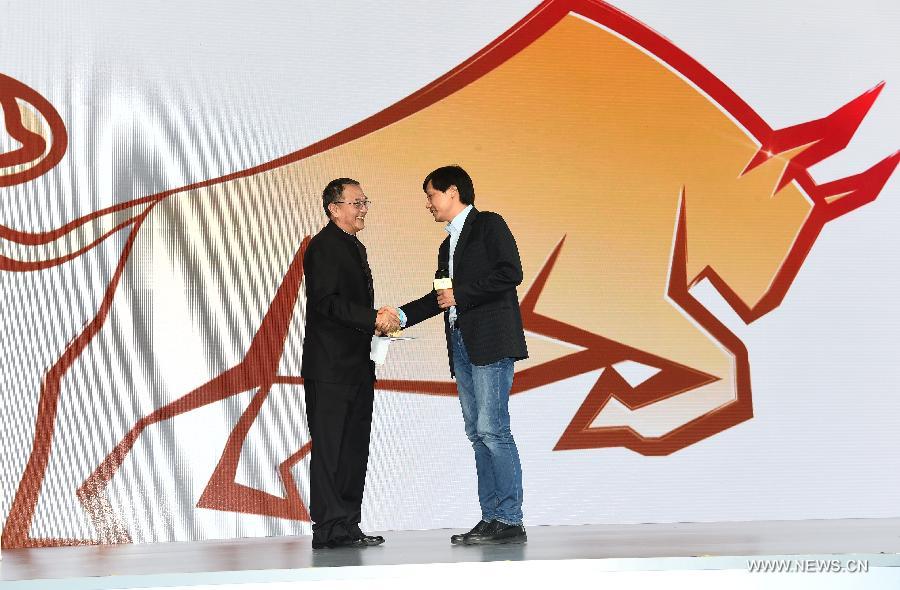 Liu Chuanzhi (L), founder and chairman of Legend Holdings, shakes hands with Lei Jun, CEO of Chinese smartphone maker Xiaomi, during a business event with the theme of "Builders and Movers" held by Legend Holdings in Beijing, capital of China, July 7, 2015. Legend Holdings, the parent company of the world's largest PC maker Lenovo, had its stock listed on Hong Kong Stock Exchange on June 29, 2015. (Xinhua/Jin Liangkuai) |