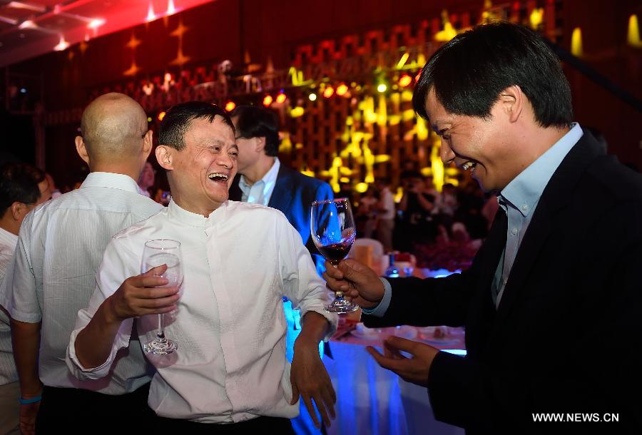 Ma Yun (L), founder and chairman of China's e-commerce giant Alibaba, chats with Lei Jun, CEO of Chinese smartphone maker Xiaomi, during a business event with the theme of "Builders and Movers" held by Legend Holdings in Beijing, capital of China, July 7, 2015. Legend Holdings, the parent company of the world's largest PC maker Lenovo, had its stock listed on Hong Kong Stock Exchange on June 29, 2015. (Xinhua/Jin Liangkuai) |