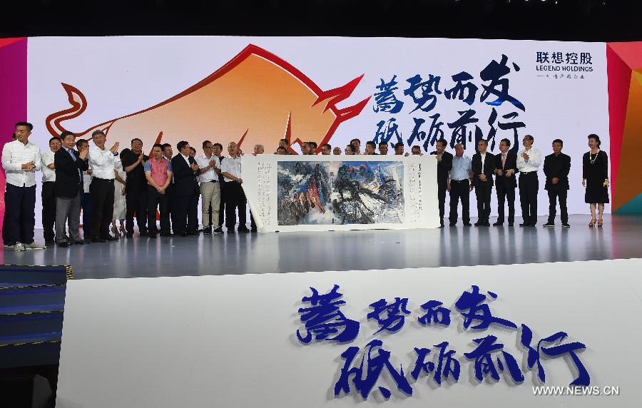 Entrepreneurs present a gift to Liu Chuanzhi, founder and chairman of Legend Holdings, during a business event with the theme of "Builders and Movers" held by Legend Holdings in Beijing, capital of China, July 7, 2015. Legend Holdings, the parent company of the world's largest PC maker Lenovo, had its stock listed on Hong Kong Stock Exchange on June 29, 2015. (Xinhua/Jin Liangkuai) |