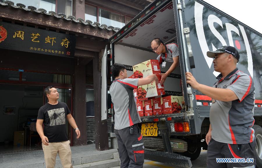 Workers of maker Zhou Jianquan's online store load newly-cooked crayfishes onto an express vehicle in Hongze County of Huai'an, east China's Jiangsu Province, July 11, 2015. The 39-year-old Zhou Jianquan opened his online crayfish store in 2015. His "wechat, ecommerce and express delivery" business mode is welcomed by a large amount of customers. (Xinhua/Zhou Hongming) |