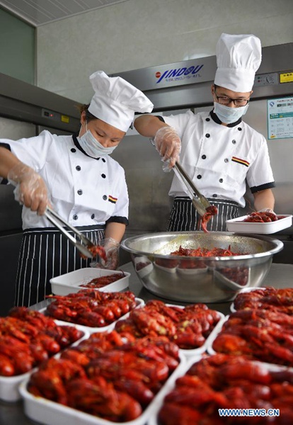 Workers of maker Zhou Jianquan's online store pack newly-cooked crayfishes in Hongze County of Huai'an, east China's Jiangsu Province, July 11, 2015. The 39-year-old Zhou Jianquan opened his online crayfish store in 2015. His "wechat, ecommerce and express delivery" business mode is welcomed by a large amount of customers. (Xinhua/Zhou Hongming) |