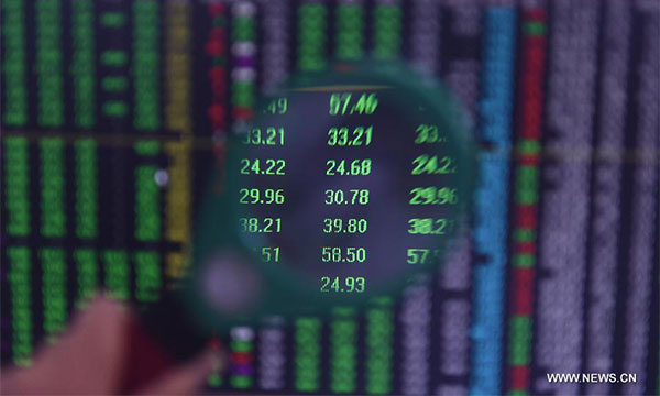 An investor looks through stock information with a magnifier in Shenyang, capital of northeast China's Liaoning Province, July 8, 2015. Chinese shares extended slumps on Wednesday, with the benchmark Shanghai Composite Index sinking 5.9 percent to finish at 3,507.19 points. The Shenzhen Component Index slumped 2.94 percent to close at 11,040.89points. (Xinhua/Yang Qing) |
