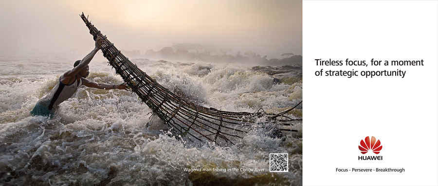 In the eyes of the photographer and his audience, the focus of the piece is often the primitive and wild appeal of the Wagenia man's fishing technique. To Huawei, the most appealing element of the fisherman's technique is focus itself. "The Wagenia place their baskets in the Congo River, where the rapids flow at 28,000m3/s. When they fish, they need to maintain sharp focus. If their baskets fall into the river, they can't get out of the way and will be swept away in the rapids. Similarly, Huawei focuses on strategic opportunities in a massive flood of data, never wasting its competitive energy on non-strategic pursuits."