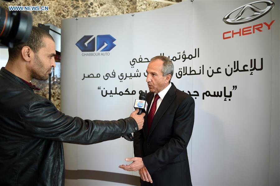 Ghabbour Auto Chairman, Raouf Ghabbour (R) speaks during an interview with Xinhua, in Cairo, Egypt, on Mar.15, 2016. China's leading auto maker, Chery International, announced Tuesday the relaunching of its Speranza cars under the new name of "Chery." The "Chery" will be assembled in Egypt in partnership with two leading Egyptian automobile corporations, Ghabbour Auto (GB) and Aboul Fotouh Automative (AFA). (Xinhua/Zhao Dingzhe)