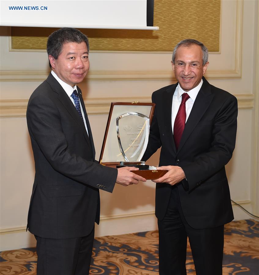 He Xiaoqing, President of Chery International (L), and Ghabbour Auto Chairman Raouf Ghabbour pose for photos in Cairo, Egypt, on Mar.15, 2016. China's leading auto maker, Chery International, announced Tuesday the relaunching of its Speranza cars under the new name of "Chery." The "Chery" will be assembled in Egypt in partnership with two leading Egyptian automobile corporations, Ghabbour Auto (GB) and Aboul Fotouh Automative (AFA). (Xinhua/Zhao Dingzhe)