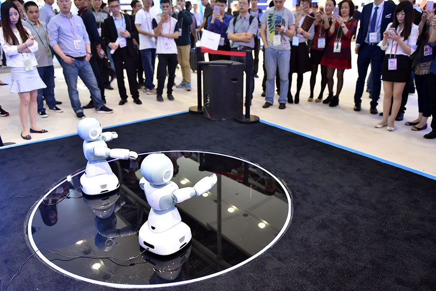 Robots are presented during the 119th China Import and Export Fair, or the Canton Fair, in Guangzhou, capital of south China's Guangdong province, April 15, 2016. A total of 24,514 enterprises from home and abroad participated in the fair. [Photo/Xinhua]