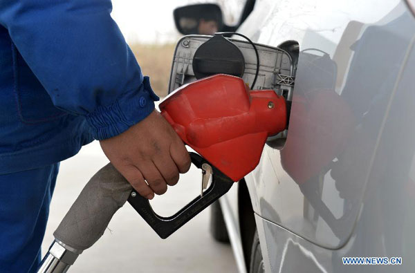 A staff member fills a car at a gas station in Baoding, north China's Hebei Province, March 12, 2014. [Photo: Xinhua]