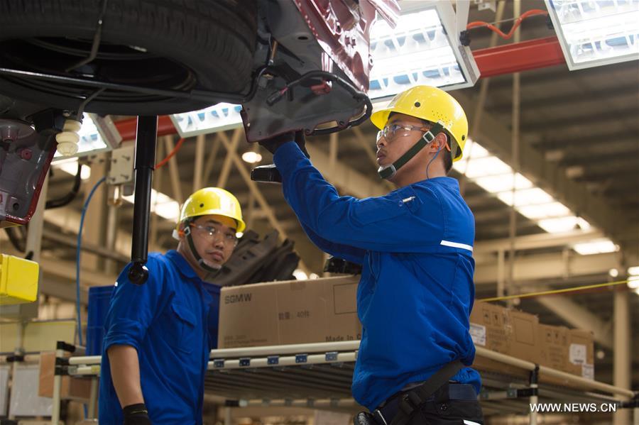 Local workers work in the factory of China's automaker Wuling Motors in Cikarang, Indonesia, on July 11, 2017. China's automaker Wuling Motors officially started production Tuesday in its newly-built facility in Indonesia. (Xinhua/Du Yu)