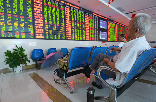 Investors check stock prices at a brokerage in Fuyang, Anhui province. On Aug 5, more than 30 stocks of defense-related, high-growth Chinese companies rose 5 percent, with nine of them hitting the daily upper limit. AN XIN / FOR CHINA DAILY