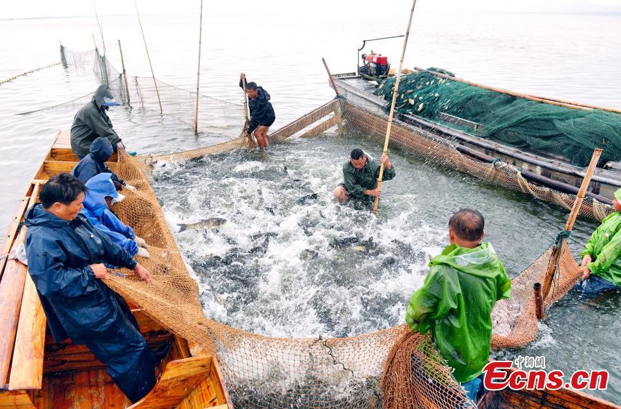 Autumn fishing begins at a fish farm in Chihu Lake in Jiujiang County, East China’s Jiangxi Province, Aug. 15, 2017. The well-protected lake, which covers an area of approximately 400 hectares, is known as a key source of high-quality fish that often sell across the country. Tens of trucks have assembled near the lake to transport the fish out. (Photo: China News Service/Yang Fengsheng)