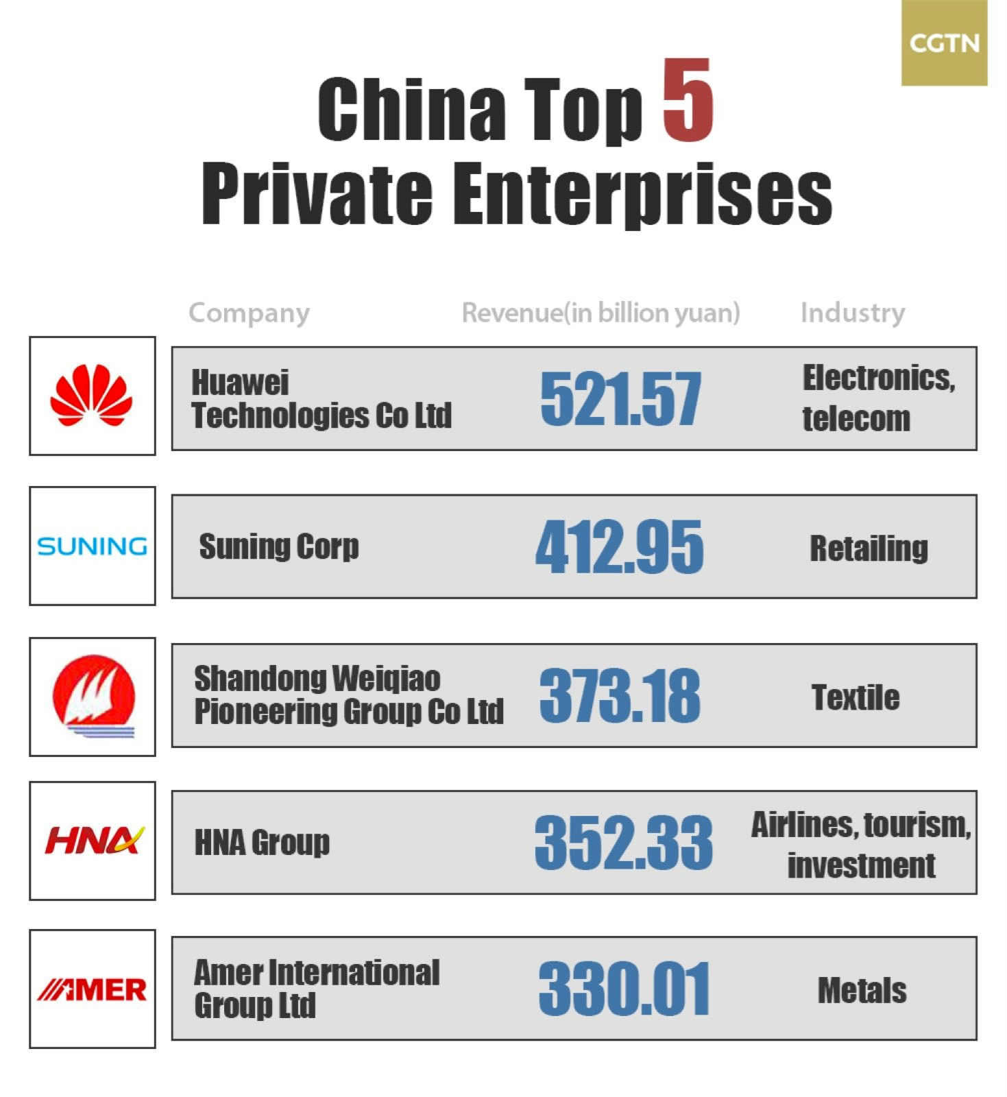?The top six companies in the latest annual ranking of China’s 500 highest-earning private firms each made a revenue of more than 300 billion yuan (45 billion US dollars) last year.