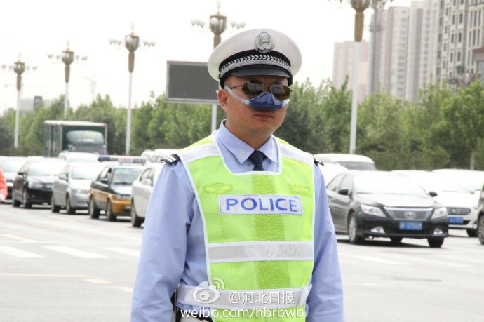 Recently, traffic policemen are equipped with the new devices, which can protect them from smog, in Shijiazhuang, capital of Hebei Province, according to weibo.com. (Photo Source: photo.news.cn/weibo.com)