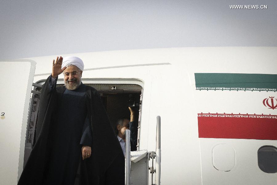 Iranian President Hassan Rouhani waves before leaving for China at Mehrabad Airport in Tehran, Iran, on May 20, 2014. Rouhani left Tehran for Shanghai on Tuesday morning to attend the Conference on Interaction and Confidence Building Measures in Asia (CICA) summit, to be held in Shanghai on May 20-21. (Xinhua/Ahmad Halabisaz)