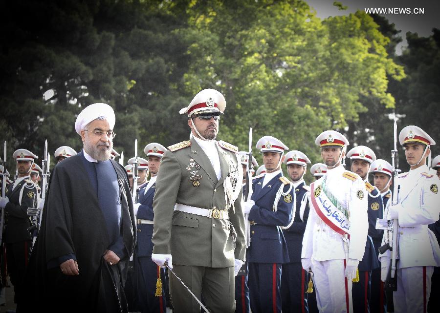 Iranian President Hassan Rouhani (L) inspects the honour guards before leaving for China at Mehrabad Airport in Tehran, Iran, on May 20, 2014. Rouhani left Tehran for Shanghai on Tuesday morning to attend the Conference on Interaction and Confidence Building Measures in Asia (CICA) summit, to be held in Shanghai on May 20-21. (Xinhua/Ahmad Halabisaz) |