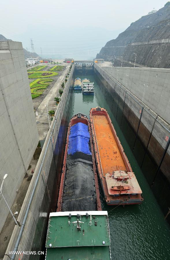Vessels line up to pass the five-level ship lock of the Three Gorges in Yichang, central China's Hubei Province, May 19, 2014. The Three Gorges have lowered its water level to meet with the upcoming flood season, which allows vessels to shorten travel time by 40 minutes as they pass the five-level ship lock of the Three Gorges. (Xinhua/Zheng Jiayu)