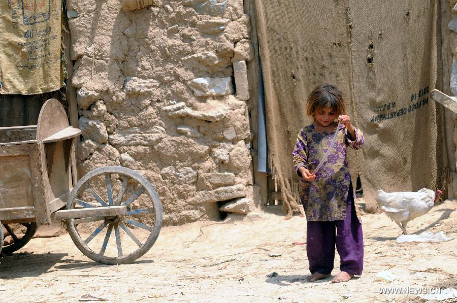 An Afghan refugee girl plays outside her makeshift home at a slum on the outskirts of Islamabad, capital of Pakistan on May 20, 2014. Pakistani authorities have launched a crackdown on Afghan refugees residing illegally in the country as fears have compounded that the exit of US-led forces in Afghanistan could ignite violence on the border. (Xinhua/Ahmad Kamal)