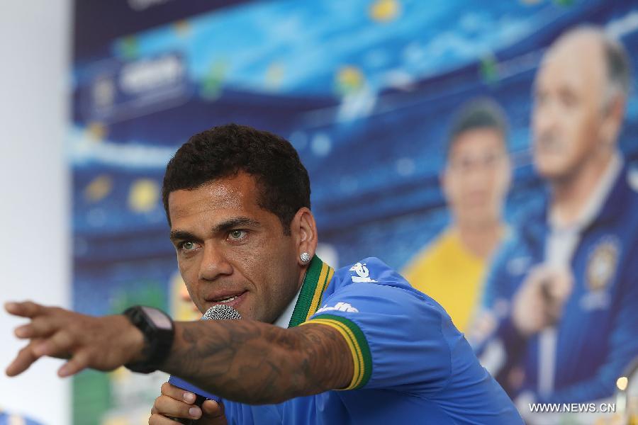 Dani Alves of the Brazilian national soccer team reacts during a press conference of a promotional event in Sao Paulo, Brazil, on May 20, 2014. (Xinhua/Rahel Patrasso)