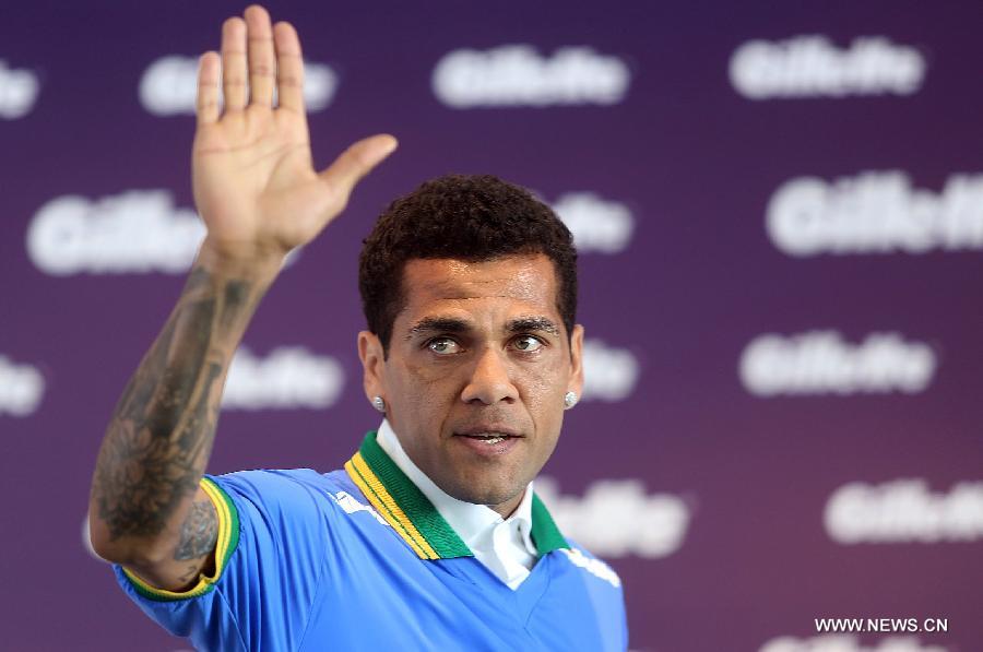 Dani Alves of the Brazilian national soccer team gestures during a press conference of a promotional event in Sao Paulo, Brazil, on May 20, 2014. (Xinhua/Rahel Patrasso)