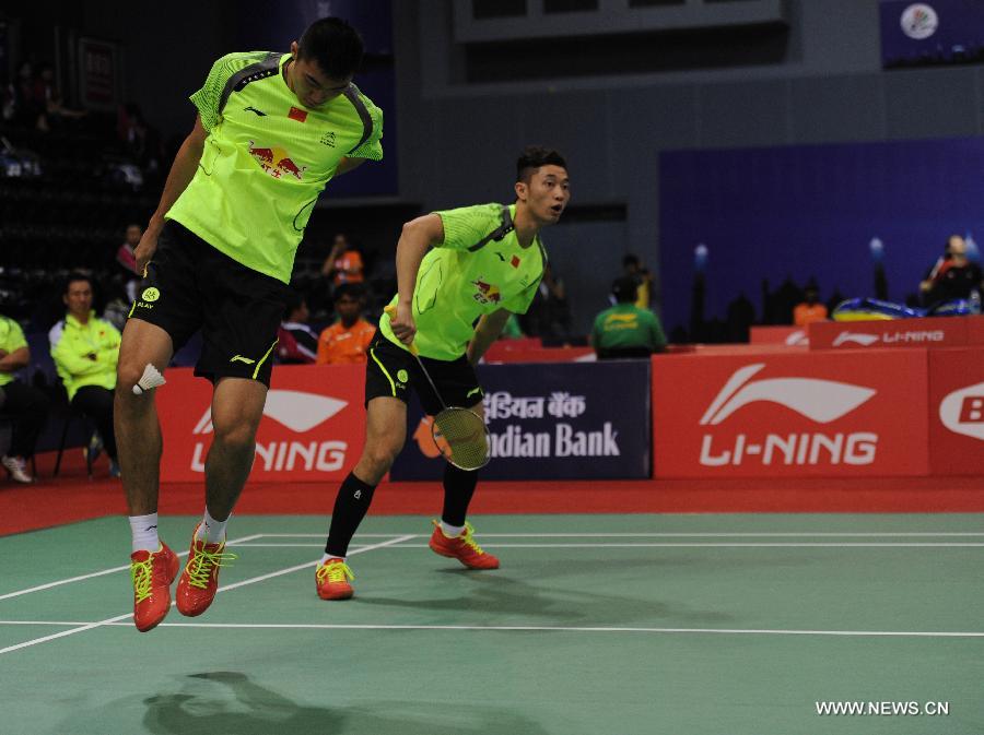 Chai Biao (R) and Hong Wei of China compete against Tsai Chia Hsin and Lee Sheng Mu of Chinese Taipei during the doubles match of Thomas Cup Group D at Siri Fort Stadium in New Delhi, India, May 20, 2014. Chai Biao/Hong Wei won 2-1. (Xinhua/Partha Sarkar)