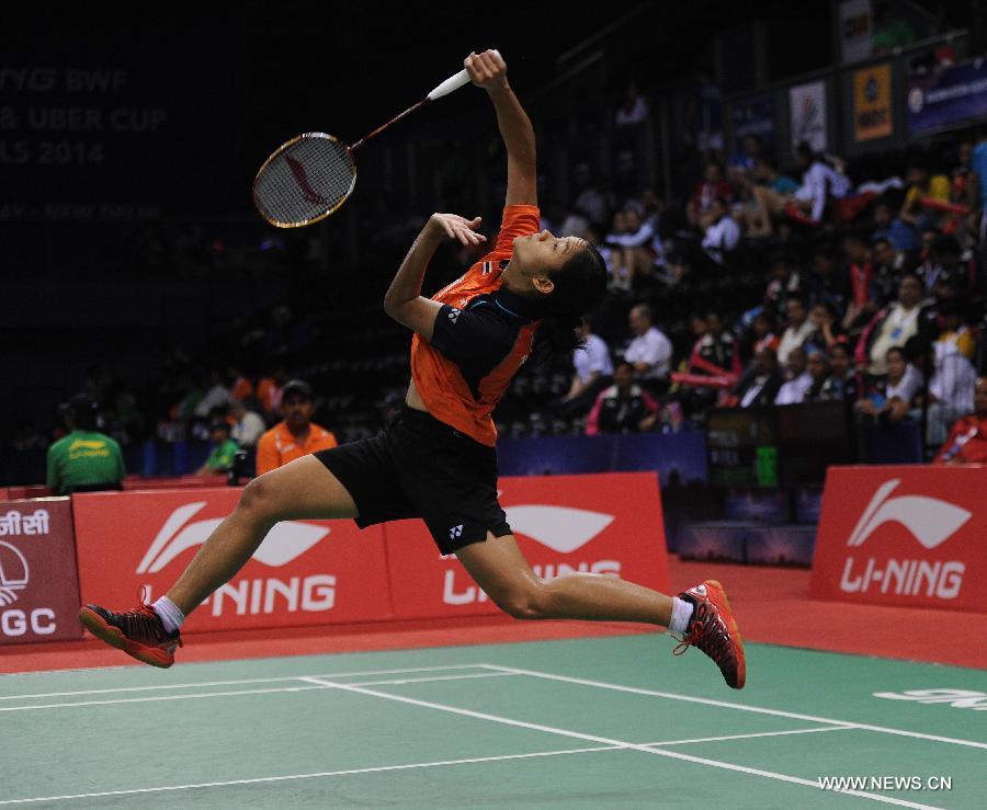| Porntip Buranaprasertsuk of Thailand returns a shot to P.V. Sindhu of India during the Uber Cup Group Y match at Siri Fort Stadium in New Delhi, India, May 20, 2014. P.V. Sindhu won 2-0. (Xinhua/Partha Sarkar) |