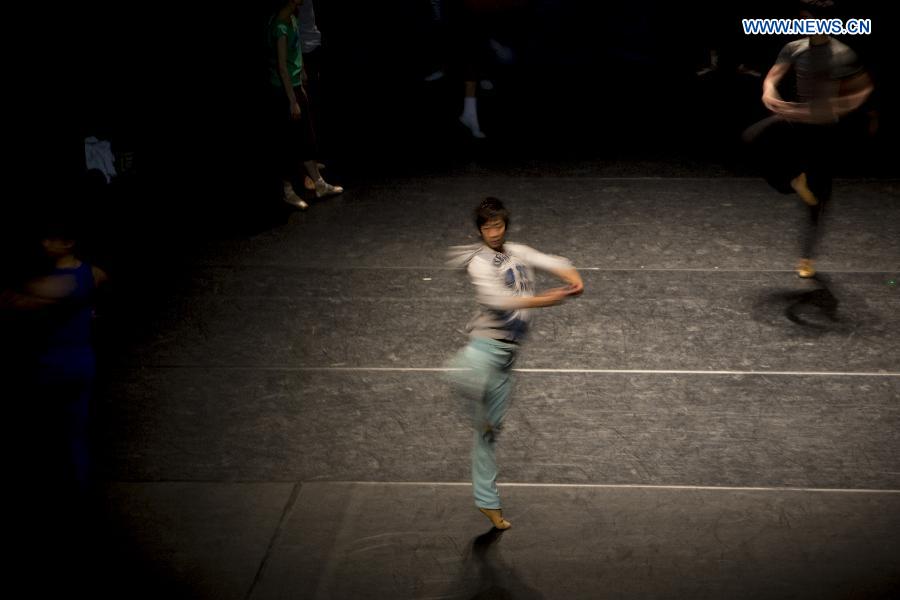 Hu Dayong, a 29-year-old ballet dancer of the National Ballet of China, practices before performance at Hainan Centre for the Performing Arts in Haikou, south China's Hainan Province, Jan. 9, 2014. Before being able to present perfect performance in the spotlight, every member of the National Ballet of China has to undergo severe arduous training for years. Yet they chose to persevere in what they truely love. Years of toiling not only allows them good body shape, expertise and disposition, but also offers them a life-long goal that deserves pursuing. The glory on stage is only a small fraction of all the time they devoted to the art. What is hidden to the audience is the integration of ballet with their lives, which could be felt every minute in their practice, during the breaks and on their journeys. (Xinhua/Zhang Cheng) |