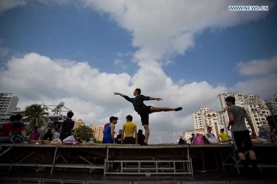 Li Jun, a 33-year-old ballet dancer of the National Ballet of China, practices before performance on a makeshift stage in Qionghai, south China's Hainan Province, Jan. 10, 2014. Before being able to present perfect performance in the spotlight, every member of the National Ballet of China has to undergo severe arduous training for years. Yet they chose to persevere in what they truely love. Years of toiling not only allows them good body shape, expertise and disposition, but also offers them a life-long goal that deserves pursuing. The glory on stage is only a small fraction of all the time they devoted to the art. What is hidden to the audience is the integration of ballet with their lives, which could be felt every minute in their practice, during the breaks and on their journeys. (Xinhua/Zhang Cheng) |