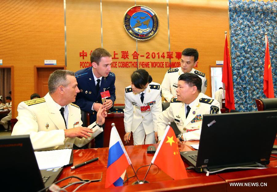 Directors of the Chinese and Russian naval forces arrange the deployment of forces in Shanghai, east China, May 20, 2014. The week-long China-Russia "Joint Sea-2014" exercise kicked off on Tuesday. A total of 14 vessels, two submarines, nine fixed-wing aircraft as well as helicopters and special forces from both sides will take part in the exercise. (Xinhua/Zha Chunming)