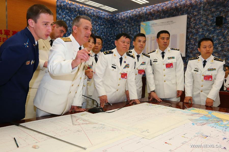 Directors of the Chinese and Russian naval forces arrange the deployment of forces in Shanghai, east China, May 20, 2014. The week-long China-Russia "Joint Sea-2014" exercise kicked off on Tuesday. A total of 14 vessels, two submarines, nine fixed-wing aircraft as well as helicopters and special forces from both sides will take part in the exercise. (Xinhua/Zha Chunming)